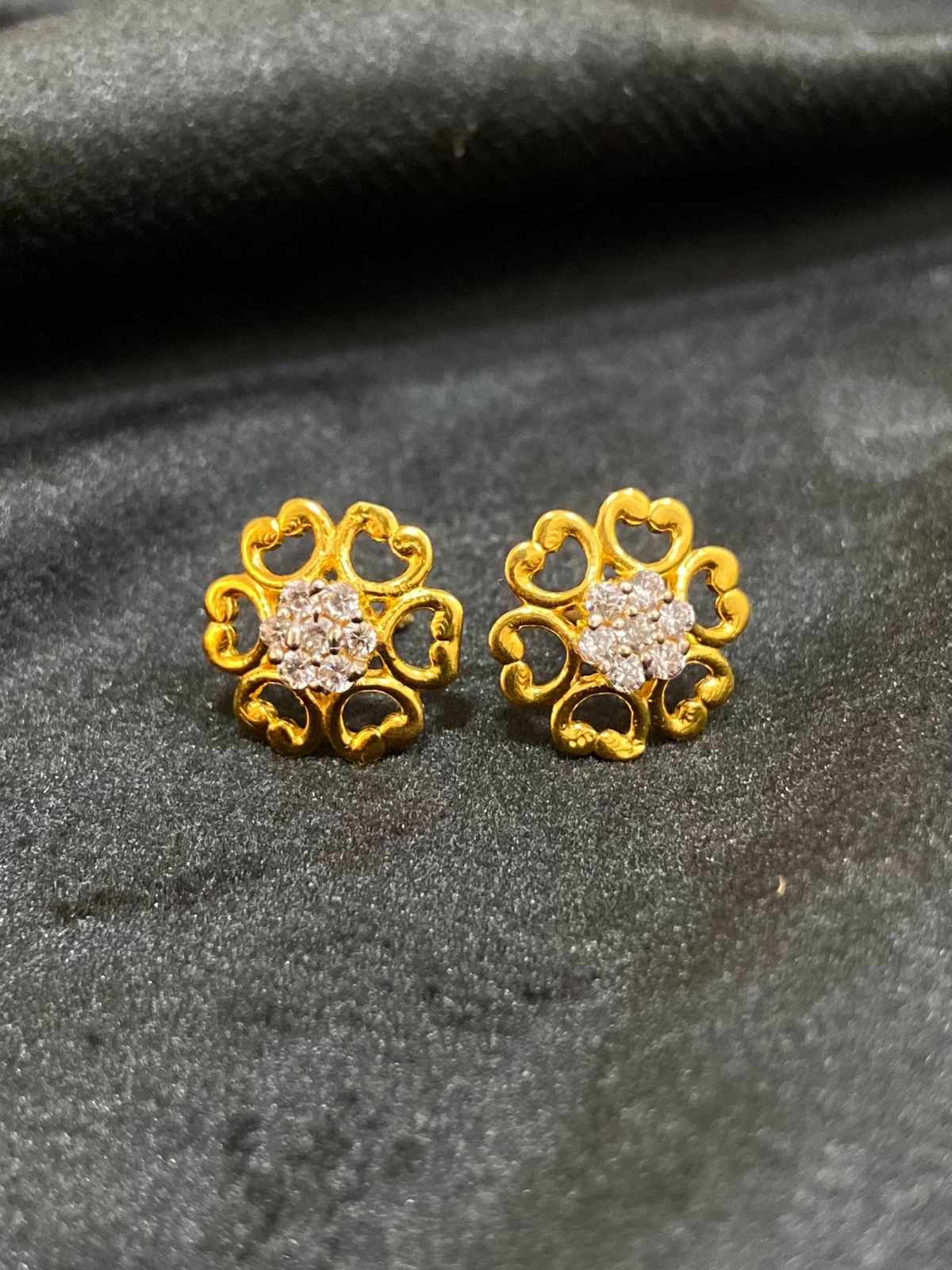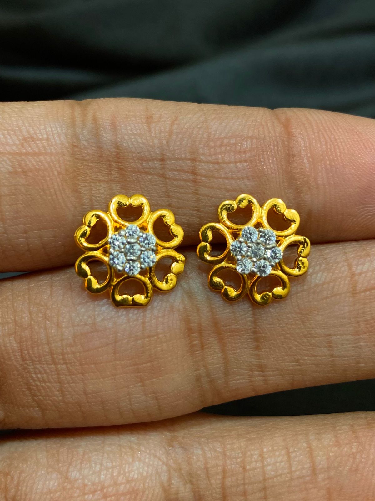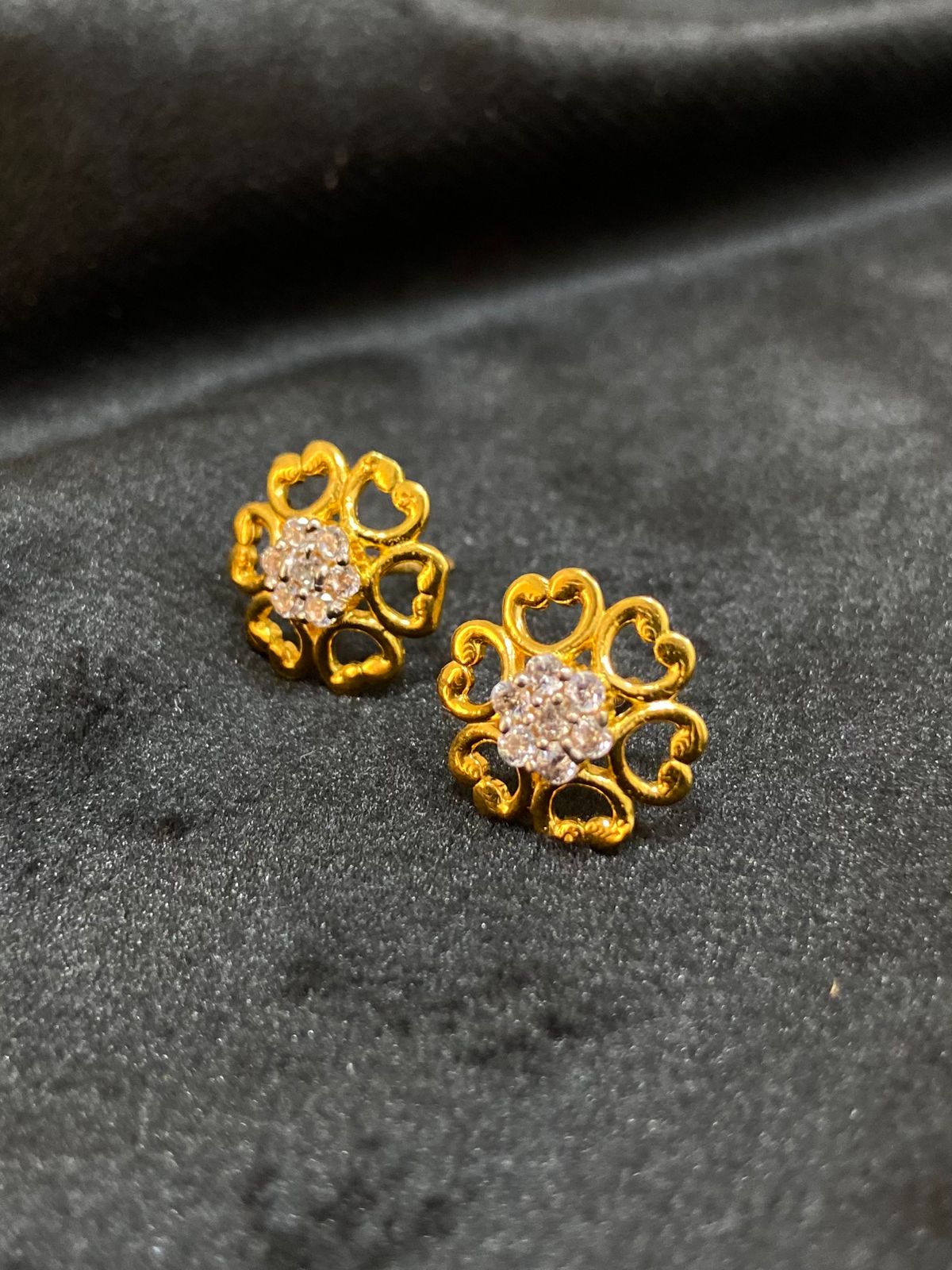Delicate gold stud earrings crafted in a charming floral design, highlighted with a sparkling stone cluster at the center. A perfect blend of elegance and everyday grace. 🌸✨