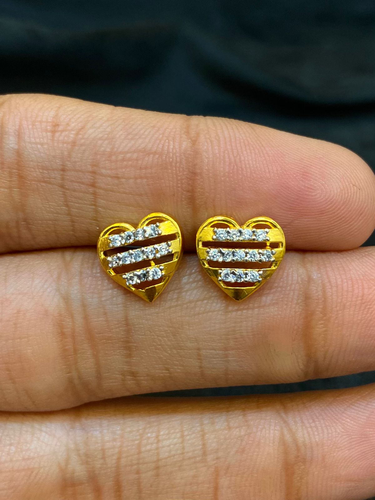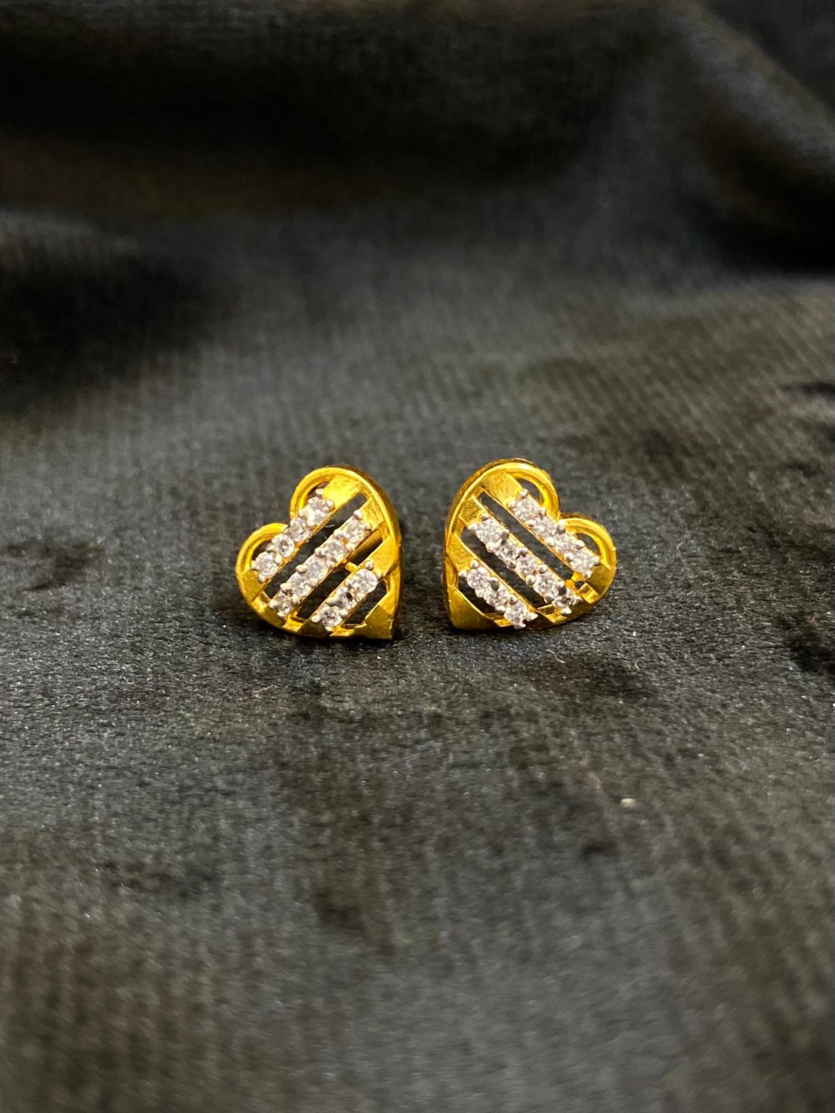 These stylish heart-shaped stud earrings are crafted in polished gold and embellished with shimmering stone-studded stripes. Modern yet elegant, they add a touch of sparkle and romance, making them perfect for both daily wear and special moments.
