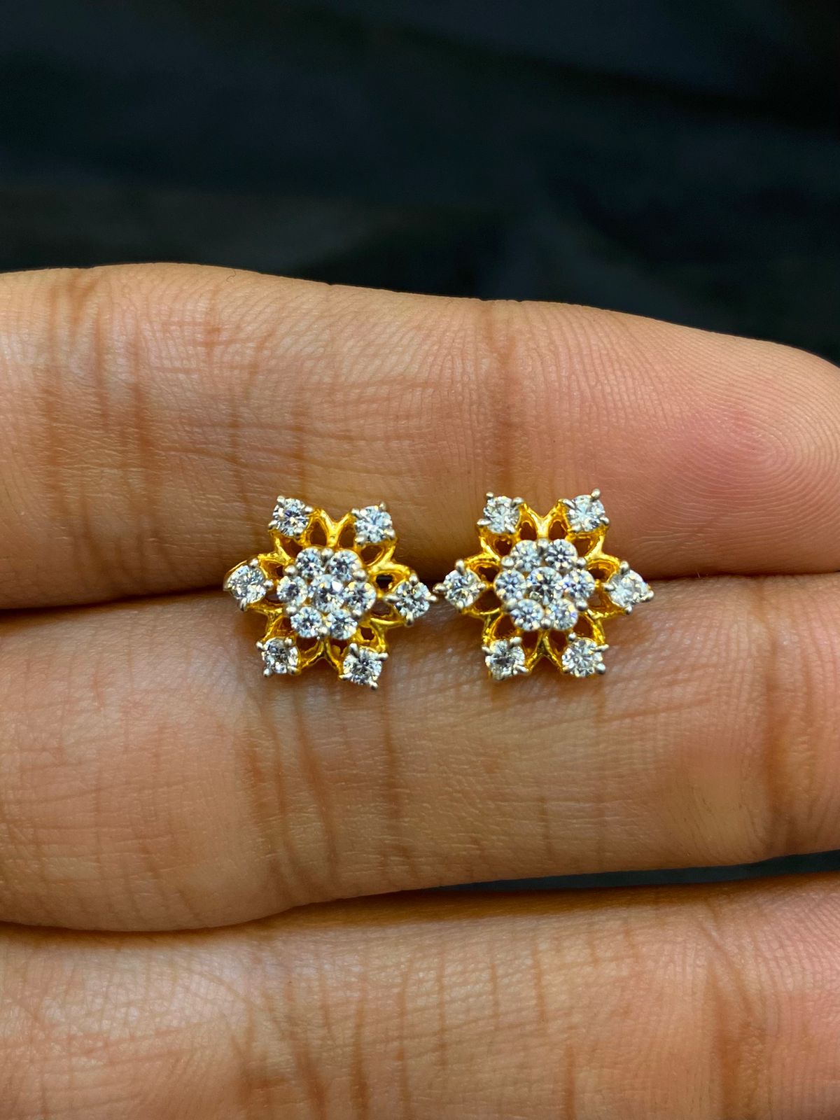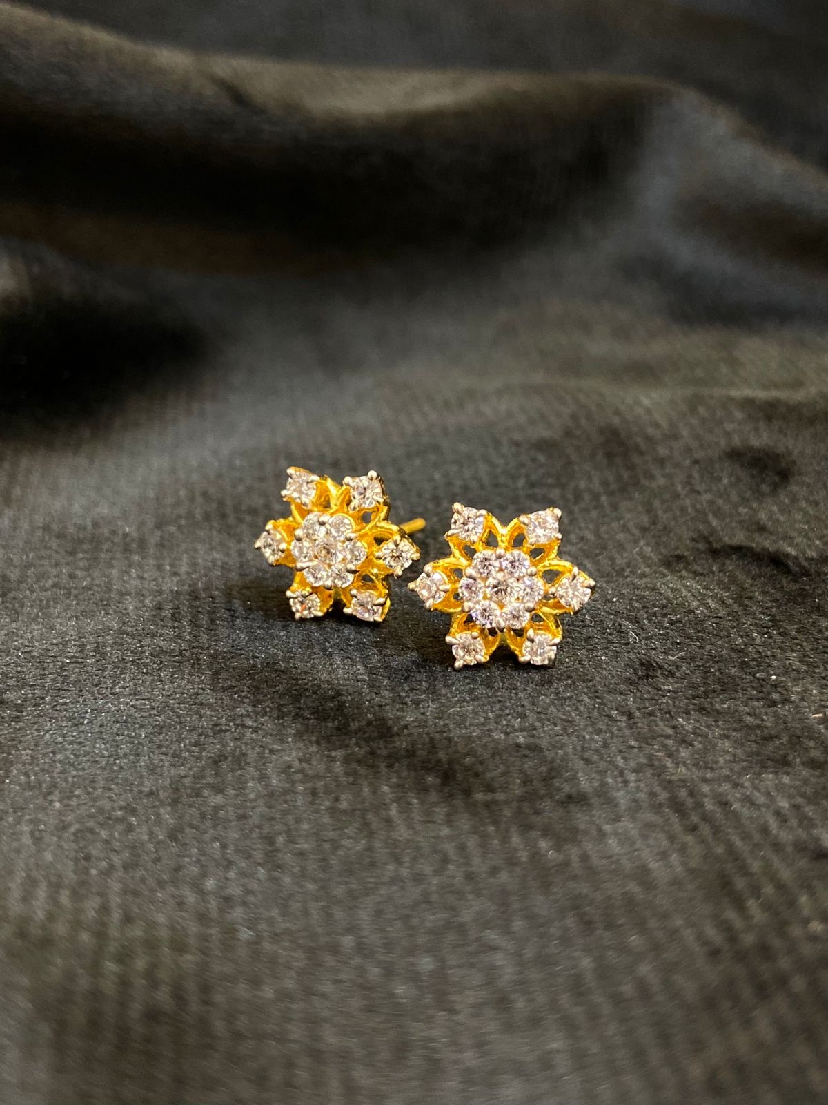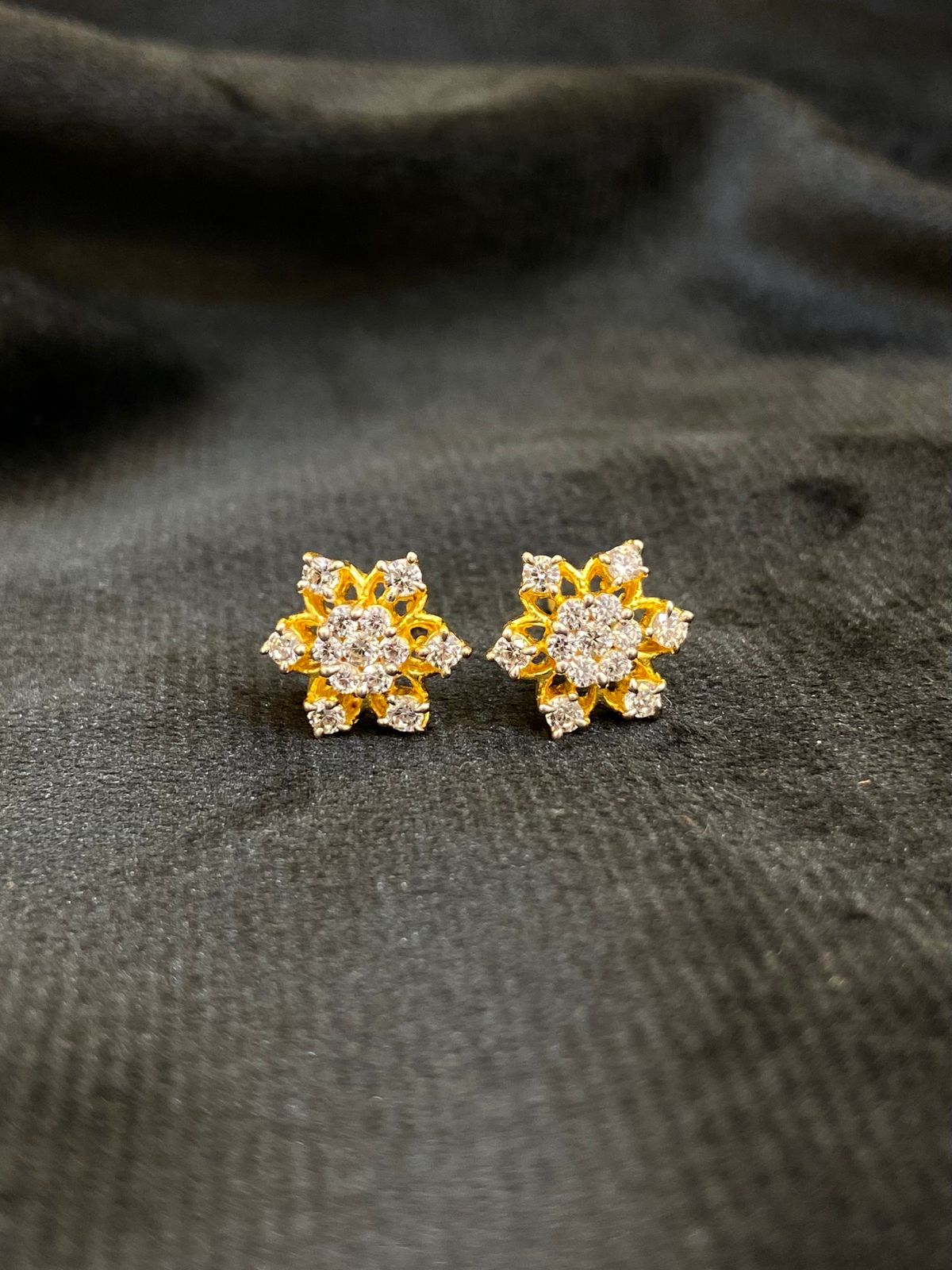 These charming flower-inspired stud earrings are crafted in radiant gold and adorned with a cluster of sparkling stones at the center, surrounded by delicate petal accents. Elegant and eye-catching, they are perfect for adding a touch of brilliance to everyday or festive looks.